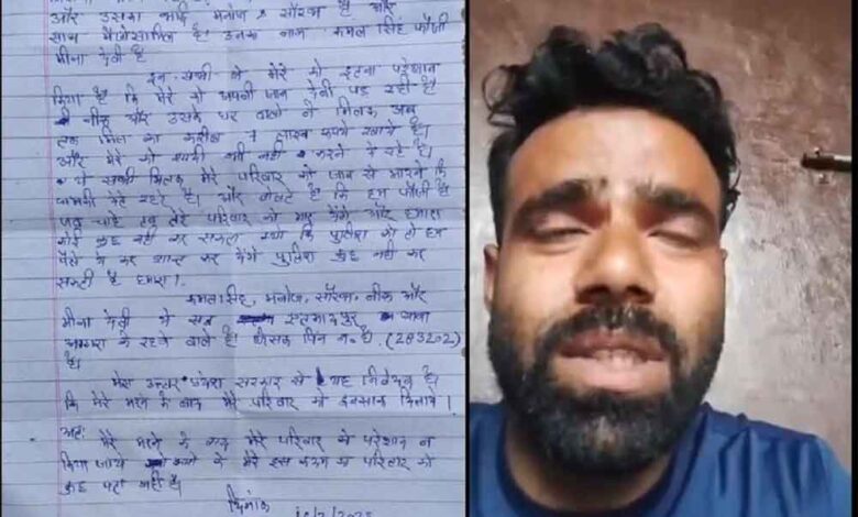 आगरा में टीसीएस मैनेजर मानव शर्मा की आत्महत्या वीडियो वायरल होने के बाद अब किरावली में थाना अछनेरा क्षेत्र में 16 फरवरी को युवक ने आत्महत्या की थी। शुक्रवार को युवक का सुसाइड नोट और वीडियो वायरल सोशल मीडिया पर वायरल हुए हैं। युवक ने आत्महत्या के लिए प्रेमिका और उसके परिजनों को जिम्मेदार ठहराया है। परिजनों की तहरी पर पुलिस ने प्रेमिका और उसके परिजनों के विरुद्ध मुकदमा दर्ज कराया है।