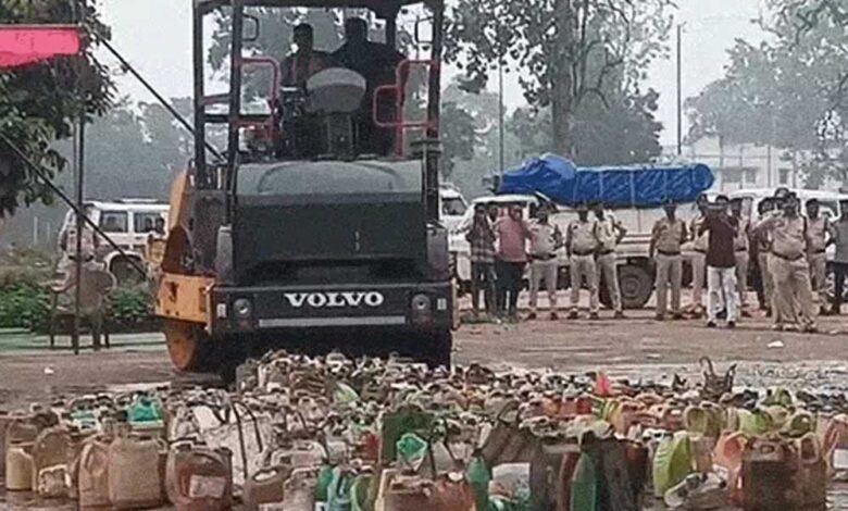 कोरबा में 10 हजार लीटर शराब पर चला बुलडोजर, 16 लाख की अवैध शराब नष्ट, 9 सालों से जब्त देसी-विदेशी शराब को हटाया