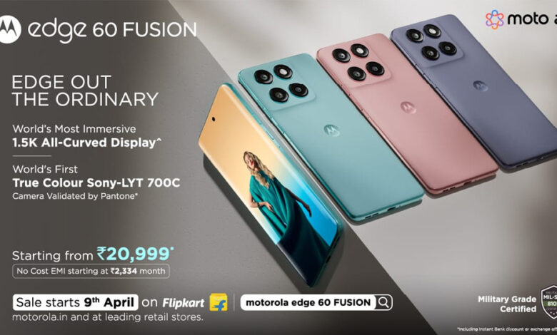 ● motorola edge 60 FUSION भारत में Flipkart, Motorola.in और प्रमुख रिटेल स्टोर्स पर 9 अप्रैल 2025 से बिक्री के लिए उपलब्ध होगा, जिसकी प्रभावी शुरुआती कीमत मात्र 20,999* रुपए होगी।